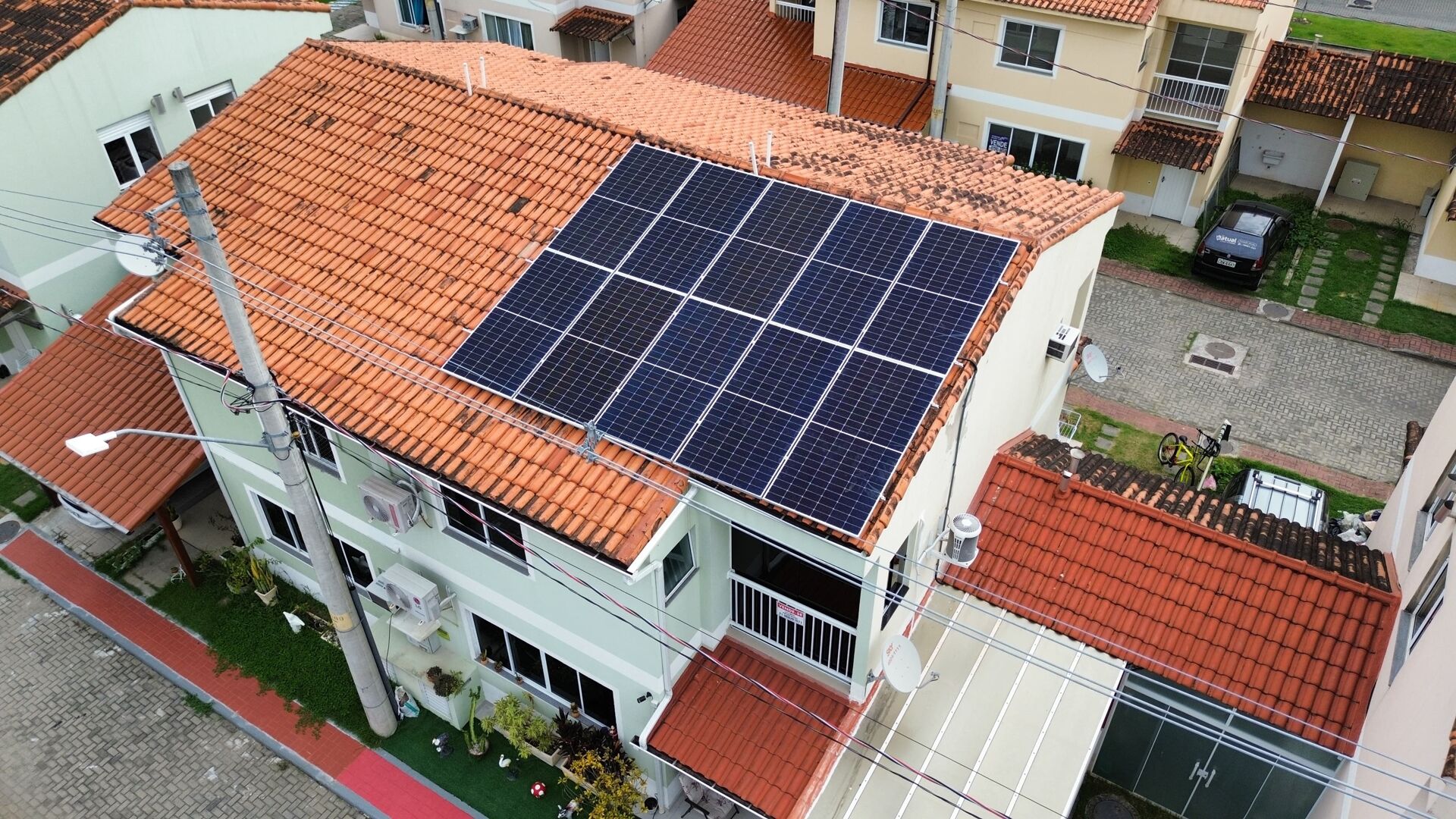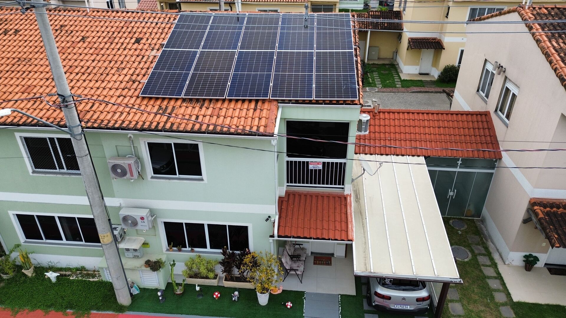 Sistemas de energia solar com painéis, segurança com câmeras, Jardim com grama sintética.